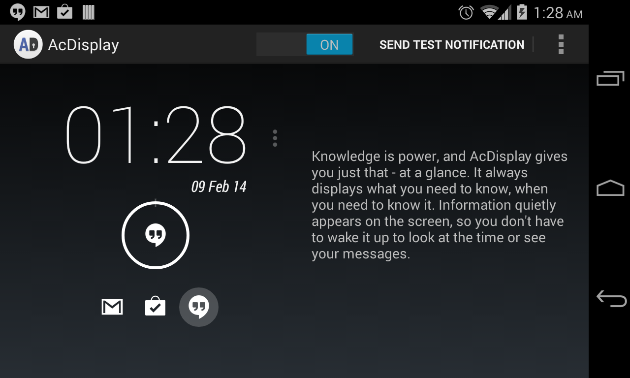 AcDisplay is a new way of handling notifications in Android. It will let you know about new notifications by showing a minimal, beautiful screen, allowing you to open them directly from the lock screen. And if you want to see what's going on, you can simply take your phone out of your pocket to view all the latest notifications, in a similarly pleasing and minimalistic manner.