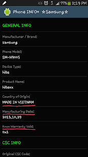 Have you ever wanted to know the Country of Origin behind the label 'MADE BY SAMSUNG'? When the phone was manufactured? How frequently the phone was used? How many times it has been connected to the Charger? Do you want to know the Knox Warranty Void status without entering to the ODIN Download Mode?... Then this app is for you.